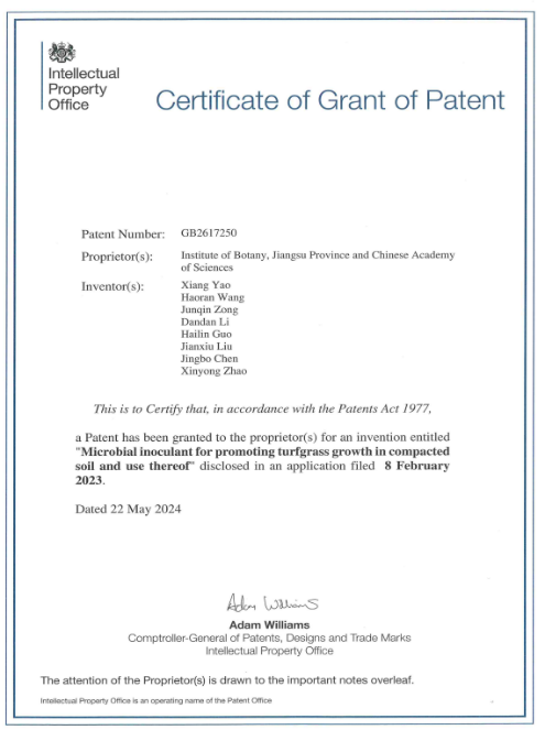 近期,我所草业研究团队研发了一种菌肥以及配套施用方法。该技术可同时发挥快速高效松土和植物促生的功能,可有效解决紧实土壤中草坪草容易退化和生长困难的行业难题。相关研究成果已获得英国发明专利授权,为国际首创,专利名:“Microbial inoculant for promoting turfgrass growth in compacted soil and use thereof”,专利号:GB2617250。草业研究中心姚祥博士为第一发明人。