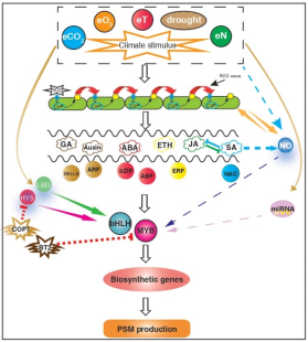 本文首先总结了植物次级代谢对主要气候变化因子(GCF)的复杂响应方式,发现了一些通用的以及一些特异性的复杂响应模式。比如,eCO2、eO3和干旱胁迫通常会刺激酚类化合物和储存态萜类化合物的产生。与此相反,eT可能会特异性抑制类黄酮的合成,而eN则对酚类和萜类化合物具有普遍抑制作用。其次,挥发性萜类物质的响应模式由于受到合成和排放系统的共同调控而更为复杂。研究还总结了两种不同GCF组合影响植物次级代谢的四种模式:协同效应、协同抑制效应、中和效应以及由一种因子决定的主导效应。之后,本文分别从生理生态和分子层面总结了植物次级代谢响应气候变化的潜在机制。在生理生态层面,植物在胁迫条件下倾向于将新陈代谢转向高度还原的次级代谢过程以减少氧化伤害,这种响应可归因于增长-分化权衡或资源/能量重排,并与植物的生态进化过程有关。从分子层面,内源激素和转录调控事件是GCF调节植物次级代谢的关键组成部分,并且不同GCF和代谢途径的相互作用受到不同激素-转录因子模块的调节。同时,转录后调控过程以及由NO和ROS介导的信号转导事件会与激素-转录因子模块协同调节植物次级代谢和环境适应性。最后,文章指出,应利用现有知识,通过植物种群重新配置、植物物种选择、应用非生物诱导剂以及开发具有较高代谢适应性的新品种等方式,缓解气候变化对生态和农业的不利影响。