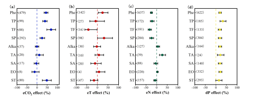 自工业革命以来,由于人类活动引起的全球气候变化逐步加剧,并对整个陆地生态系统造成不可逆转的威胁。其中,以二氧化碳升高(eCO2)、增温(eT)、氮沉降(eN)和降水量减少(dP)为代表的气候变化事件不仅影响了生态系统的多样性及稳定性,还对植物生理代谢产生不可预测的影响。植物代谢物可分为初级代谢物及次级代谢物两类,其中,包括氨基酸、有机酸和碳水化合物在内的初级代谢物对植物生命活动不可或缺,并且其响应多种气候变化因子的规律已被基本阐明;相比之下,次级代谢物广泛参与植物品质形成和环境适应性,但是目前尚未有研究系统揭示全球气候变化背景下的植物次级代谢响应模式。