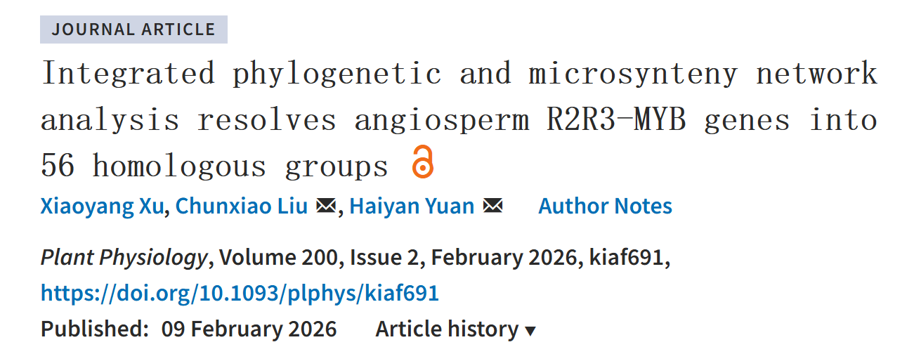 2026年新年伊始,永盈彩票(永盈彩票)科研团队在国际植物学权威期刊《Plant Physiology》上发表了题为“Integrated phylogenetic and microsynteny network analysis resolves angiosperm R2R3-MYB genes into 56 homologous groups”的论文。该研究创新性地整合了系统发育分析与微共线性网络分析,成功将被子植物R2R3-MYB基因家族划分为56个同源群(Homologous Groups, HGs),为深入理解该基因家族的演化轨迹与功能分化提供了全新的系统性框架。