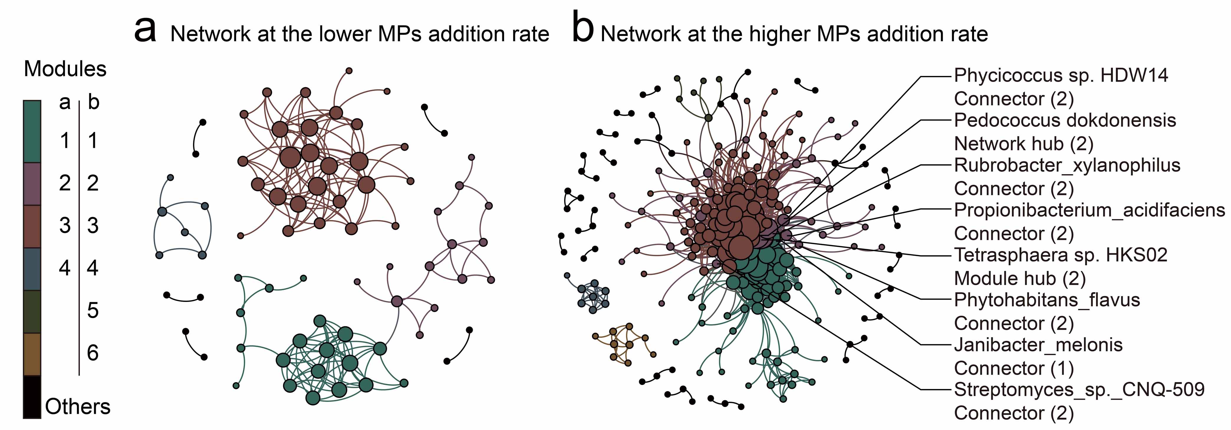 图2 微塑料添加对土壤微生物群落网络结构的影响