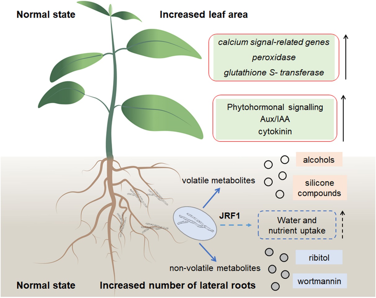综上所述,JRF1可成功定殖于宿主植物根系建立有益的共生关系,从而促进植物从土壤中吸收水分和养分。另一方面,JRF1能够产生多种挥发性和非挥发性代谢物,JRF1与其代谢产物的共同作用促进了植物的生长。