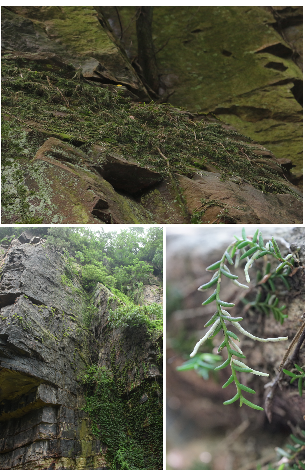 植物迁地保护中心植物分类与保护团队长期从事植物资源普查工作,前期考察过程中在南通狼山森林公园近乎垂直的峭壁上发现了兰科珍稀濒危植物蜈蚣兰(Cleisostoma scolopendrifolium (Makino) Garay)。调查共发现了蜈蚣兰两个居群,一个分布面积约20平方米,另外一个约5平方米。该植物叶片革质,呈匍匐状,白色气生根和叶片形成鲜明对比,状如蜈蚣,故名蜈蚣兰。