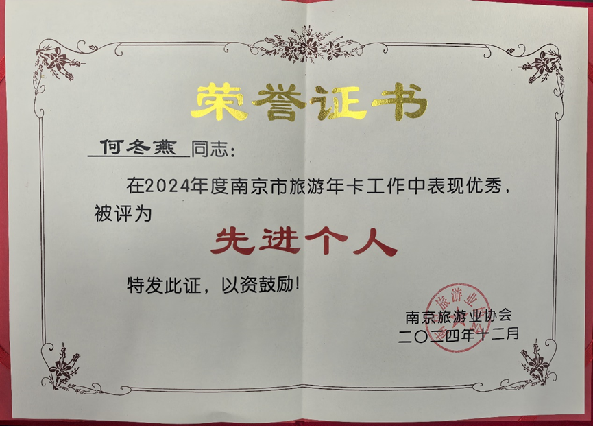12月30日,2024年度南京旅游业协会总结暨表彰大会在宁召开,大会对在2024年推进南京旅游高质量发展中充分发挥先锋模范作用和成绩突出的单位和个人进行了表彰。永盈彩票荣获2024年度南京旅游景区“先进单位”称号,两位票务岗位同志获得“先进个人”称号。