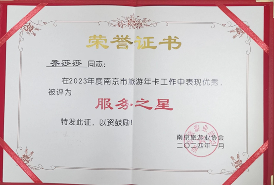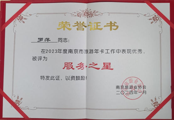 大会对在2023年推进南京旅游高质量发展中充分发挥了先锋模范作用的单位和个人作出了表彰,我园荣获2023年度旅游年卡“示范单位”称号,两位票务岗位同志获得“服务之星”称号。