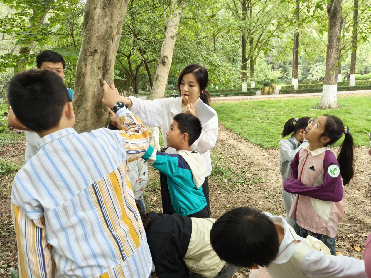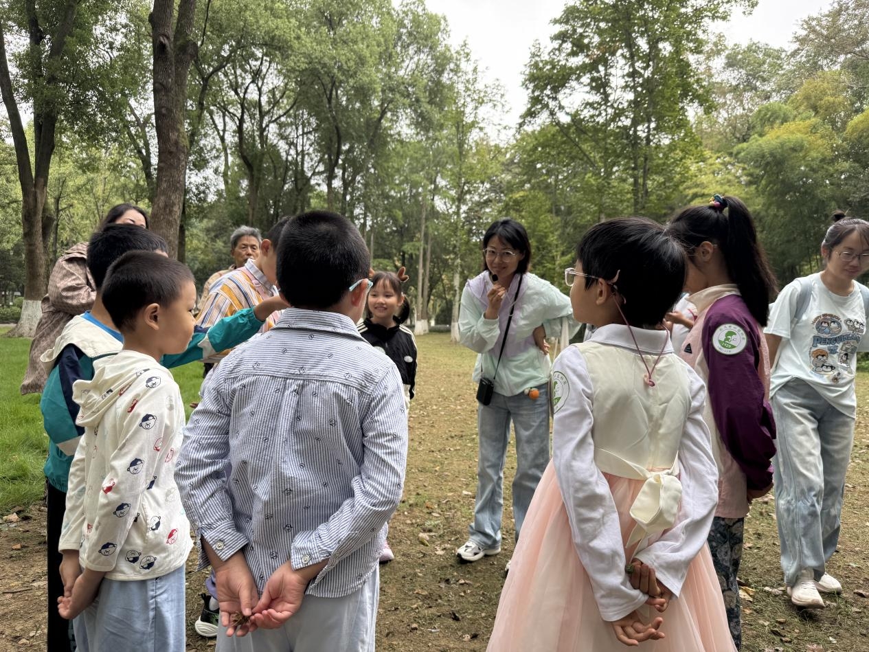 9月20日的亲子专场,10组家庭在趣味游戏中开启探索之旅。孩子们通过触摸银杏、秤锤树等珍稀濒危植物的果实(种子)进行盲猜配对,瞬间点燃了好奇心:“银杏很常见为什么也濒危?”“什么样的植物需要保护?”科普老师顺势引导,通过互动问答深入浅出地讲解了珍稀濒危植物的定义、濒危原因及保护意义。随后,孩子们来到国家一级保护植物银缕梅树下,调动视觉、触觉、嗅觉多感官观察它的树干、叶片与果实,在任务单的指引下完成了对园内8种珍稀濒危植物的自主探究,深刻体会到这些“活化石”历经生存考验的坚韧与珍贵。