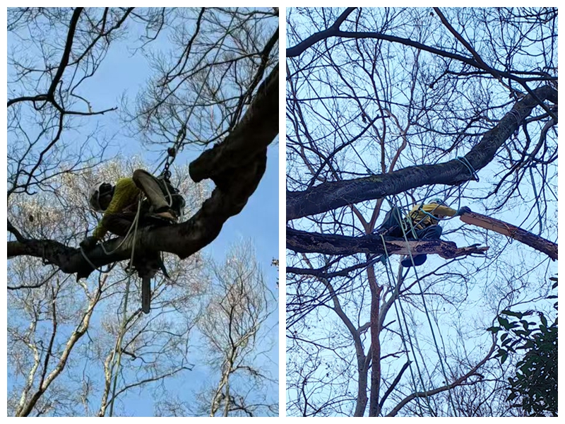 上午的专业演示中,攀树师身着全套专业装备,凭借娴熟的攀树技巧与丰富的实操经验,灵活穿梭于高大的朴树枝干之间。本次演示教学的核心任务是清除红枫岗上一棵朴树上两根倾斜且存在安全隐患的腐枝。作业过程中,培训教练精准判断腐枝位置与结构,运用专业工具规范操作,高效完成了腐枝锯除工作,既保障了树木健康生长与园区环境安全,也为在场员工直观呈现了工作攀树的标准化流程与安全操作规范。