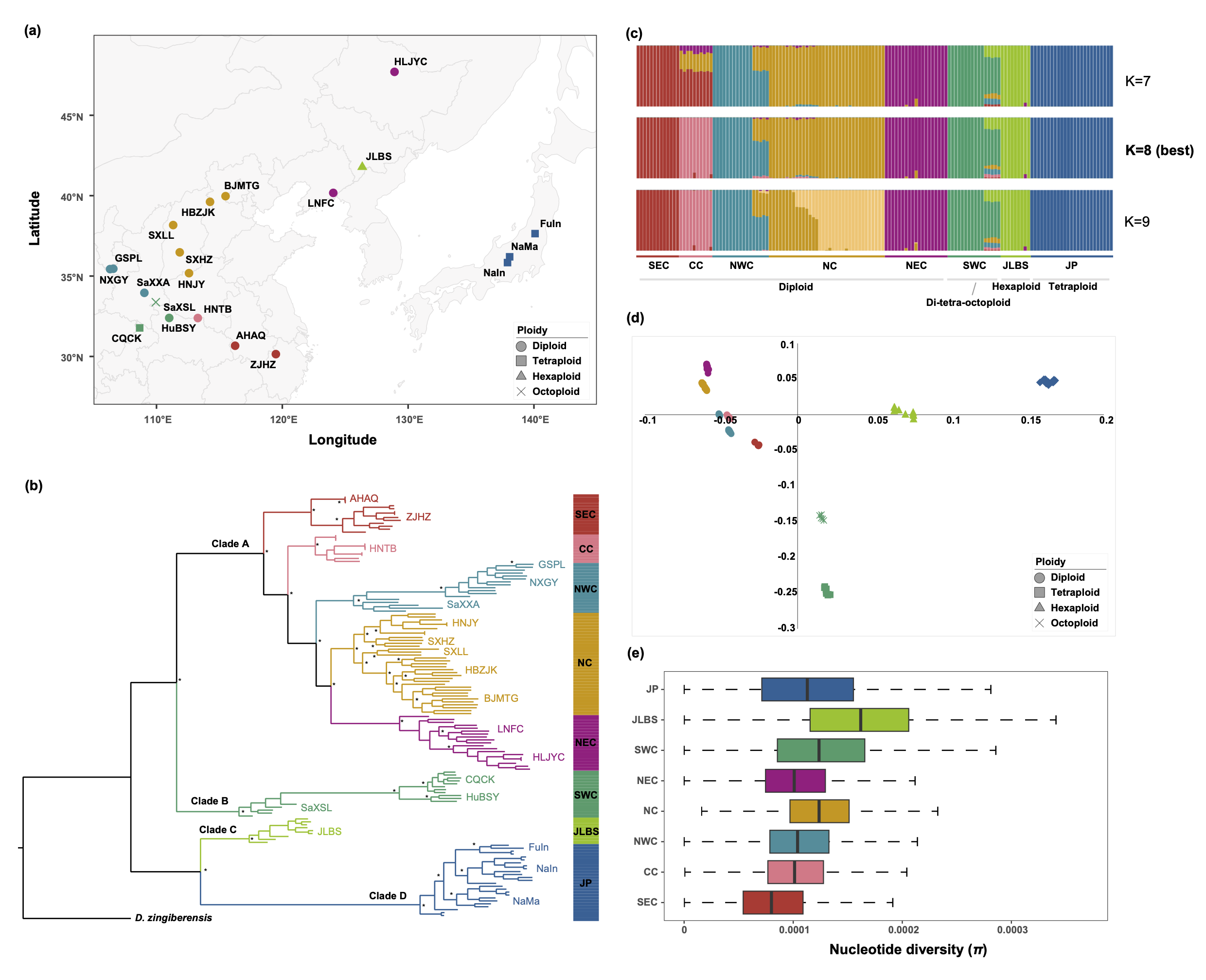 本研究通过对穿龙薯蓣进行系统的野外调查、样品采集和倍性鉴定,证实了穿龙薯蓣自然群体中存在二倍体、四倍体、六倍体和八倍体四种倍性变异类型。通过破译二倍体穿龙薯蓣的单倍型基因组,并结合群体基因组学分析,揭示了穿龙薯蓣群体中存在八个主要遗传谱系。此外,结合转录组分析,明确了薯蓣皂苷合成通路中关键基因的表达和演化模式,证实了根状茎是薯蓣皂苷合成的关键部位,同时发现CYP90和CYP94基因拷贝数扩增促进了薯蓣皂苷的合成。