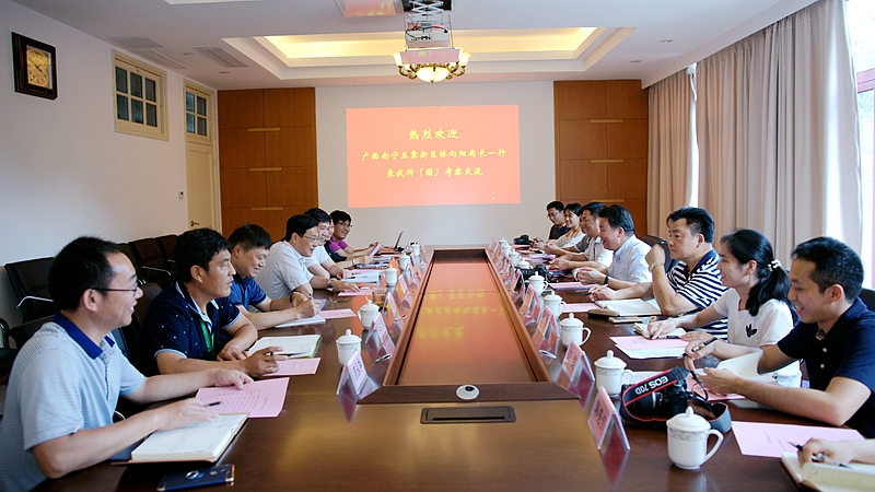 7月17日下午,广西南宁五象新区管委会生态环保局林向阳局长率代表团一行来我永盈彩票考察交流,代表团成员包括南宁市林业和园林局、五象新区管委会规划建设局、财政局、国土局、南宁市五象岭森林公园、园林规划设计院等部门和单位负责人。所党委书记宇文扬会见了代表团一行,所党委委员汤诗杰及园艺与科普中心、后勤(保卫)处等部门负责人参加接待与交流。