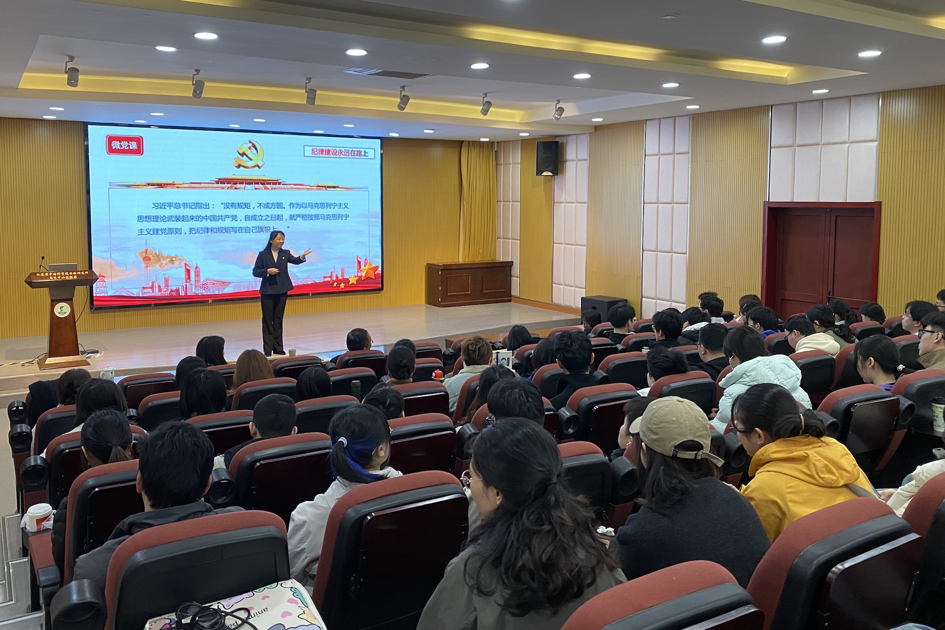 2025年3月28日下午,我所研究生在综合楼第二会议室开展了专题党课活动,南京审计大学马克思主义学院院长金晶教授受邀来所为研究生讲授题为《纪律建设永远在路上——中国共产党新民主主义革命时期的纪律建设探索》的党课,所党委书记杨天水出席活动,全所研究生参加了本次活动。