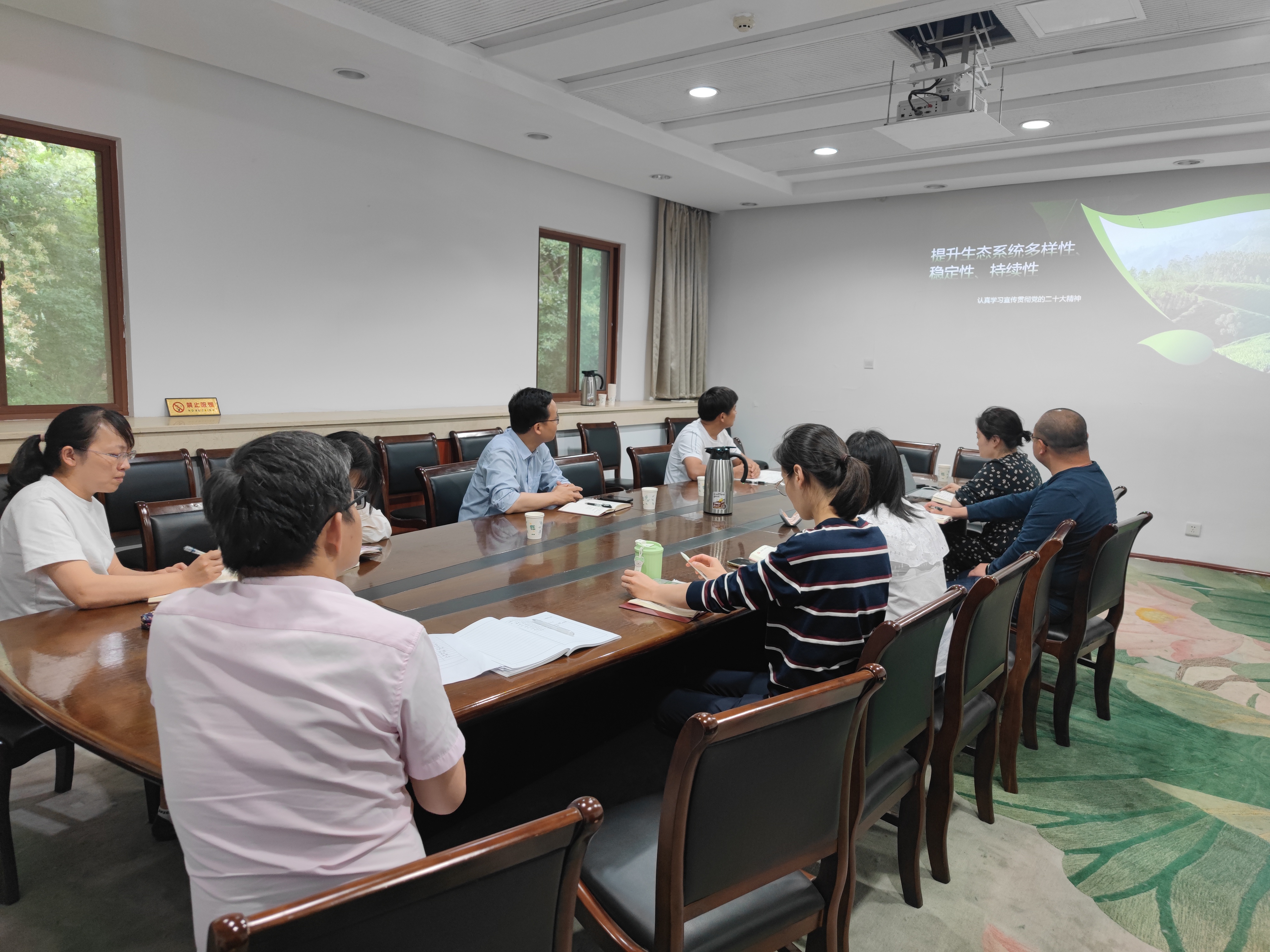 随后,支部副书记李晓丹同志分享了党的二十大精神学习心得,从我国提升生态系统多样性、稳定性、持续性的历史性成就、总体要求以及任务和举措三个方面进行了详细的讲解。