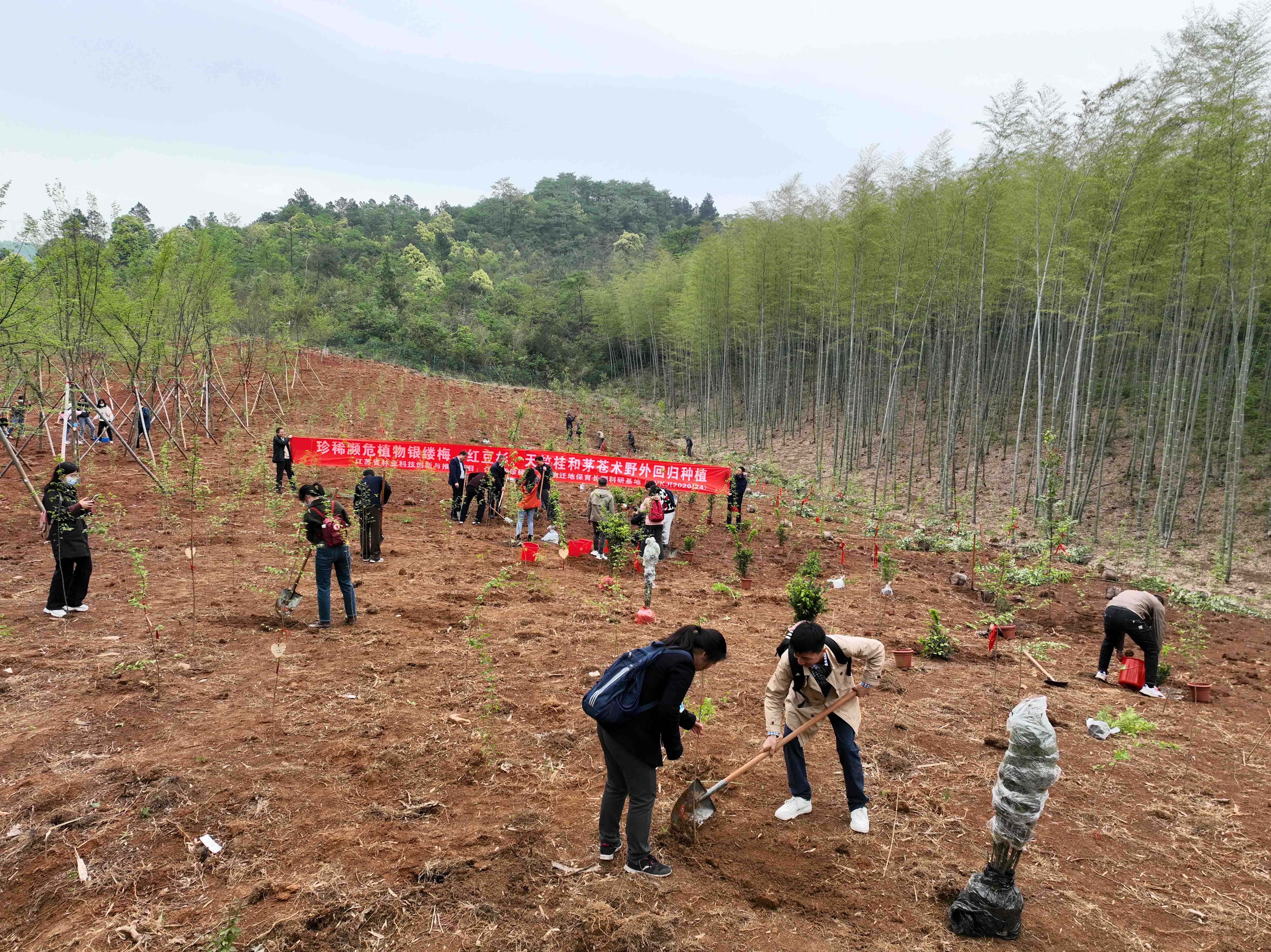 4月26日上午,中心全体成员在汪仁副所长的带领下来到宜兴国家森林公园开展了“珍稀濒危植物回归引种”活动。植物园作为野生植物物种保护的“诺亚方舟”,保护中国珍稀濒危野生植物资源是时代赋予我们的使命与责任。珍稀濒危物种的野外回归是其保护工作的标志性环节,是增加珍稀濒危物种野外个体数量,推动其种群大小有效恢复的必要途径,对于生态系统、物种多样性及遗传多样性的维持,有着很重要的作用。当日,全体参与人员共同进行了银缕梅、天竺桂、南方红豆杉和茅苍术的回归引种种植,大家热火朝天的将四种珍稀濒危植物栽种到指点位点。双方负责人一致认为本次活动具有重要意义,未来将持续合作开展珍稀濒危植物的迁地保护和就地保护工作。中心成员也纷纷表示将响应国家号召,切实承担起生物多样性保护重任。