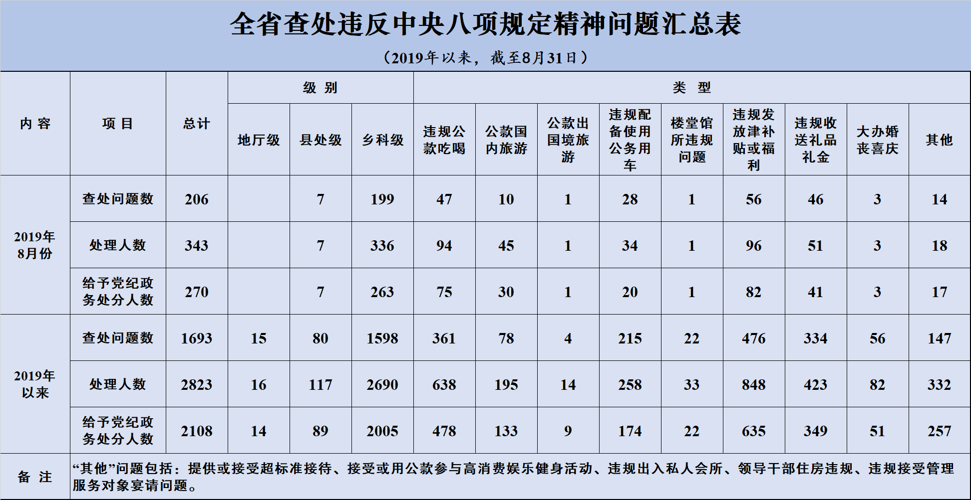 2019年8月,全省共查处违反中央八项规定精神问题206起,处理343人,其中给予党纪政务处分270人。从处理干部级别看,查处县处级干部7人、乡科级及以下干部336人。从查处问题类型看,违规发放津补贴或福利问题最为突出,有56起;其次是违规公款吃喝和违规收送礼品礼金问题,分别为47起、46起。这3类问题占到查处问题总数的72.3%。