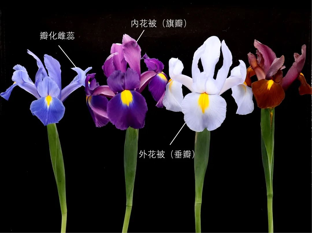 荷兰鸢尾的花部结构由垂瓣、旗瓣、瓣化雌蕊及位于垂瓣和雌蕊之间的雄蕊组成。荷兰鸢尾花色丰富,主要有蓝紫色系、黄色系和白色系,近年来我园鸢尾研究团队还引进了紫红色、紫罗兰色、黄白复色等荷兰鸢尾新品种,极大丰富了观赏体验。