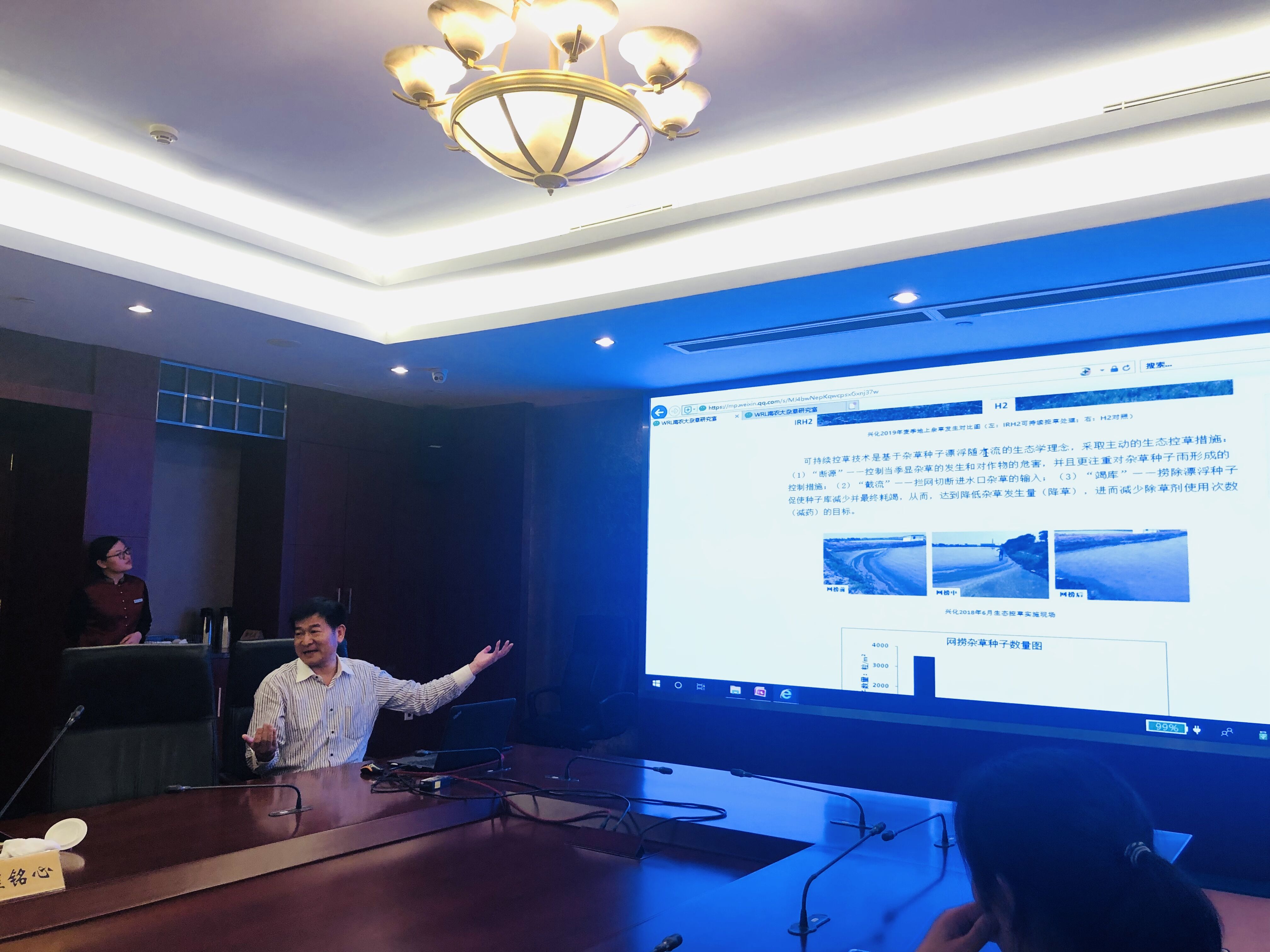 下午,专家团队与锡山区副区长周建伟、科技局局长郁枫、农村农业局吴燕南主任、区环保局副局长林伟庆、台创园主任程铭心进行了座谈交流。副区长周建伟首先对锡山区整体概况进行了介绍,各分管负责人分别介绍了锡山区农业、环保、产学研合作以及台创园运转等情况,并就现有亟待解决的问题向专家寻求意见和建议。专家团队成员分别结合自身科研情况,向政府部门进行献计献策,强胜副理事长就“降草”“减药”可持续控草技术--助力粮食安全生产进行了介绍。