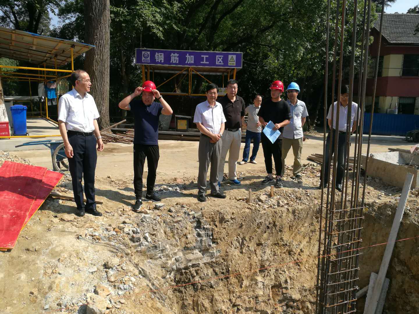 所领导一行认真听取了项目负责人就施工进展情况作的工作汇报,并对施工现场进行了查看。薛建辉所长对施工方目前的施工情况予以肯定,同时要求他们再接再厉,保质保量完成研究生公寓建设。宇文扬书记提出质量为本,安全第一,夏季施工,要求施工方做好工人的防暑降温工作。施工方负责人承诺一定按照领导指示,做好质量和安全措施,同时表示按照施工进度表,会在8月份完成建筑主体施工,年底完成内部装修,明年4月前竣工验收。